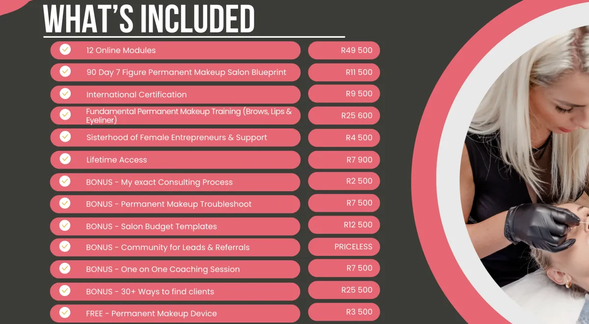 Meet your trainer, introduction to the business model, what makes it profitable and the complete guide to how I grew my 7 figure Permanent Makeup Salon.